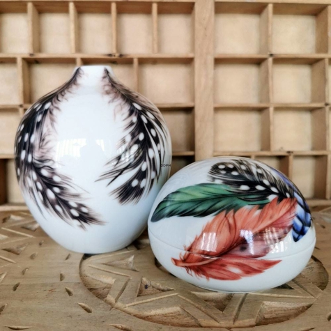 For første gang prydes årets påske bonbonniere af farvede fjer, som en smuk påmindelse om Royal Copenhagens fascination af at skildre naturen på deres kreationer gennem 250 år. Fjerene på bonbonnieren 2025 har forskellige former og farver og minder os om naturens mangfoldighed. Den grønne grønne og blå fjer stammer fra skovskaden, den røde fjer fra rødstjerten og den brune fjer fra perlehønen.