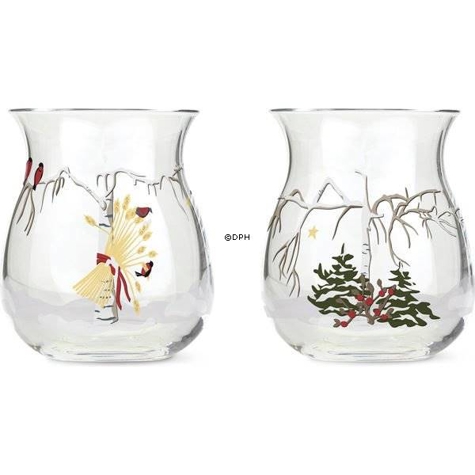 Lysestagerne er perfekte til hygge i vintermåneder, hvor det er mørkt og koldt udenfor og stearinlys bringer hygge og varme indendørs. Motivet på den ene lysestage er et snedækket træ med lange grene, hvor de smukke vinterfugle kan sidde. Nedenunder træet sidder et havreneg, så fuglene har nok at spise i vintertiden. Den anden fyrfadsstage har ligeledes motiv af et snedækket træ med store grene og to små grantræer nedenunder.