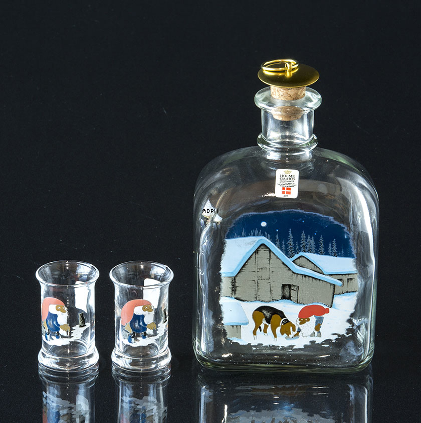 Holmegaard Juleflaske med motiv af Harald Wiberg nisse med kat, samt 2 dramglas ligeledes med motiv af Wiberg nisse og kat.