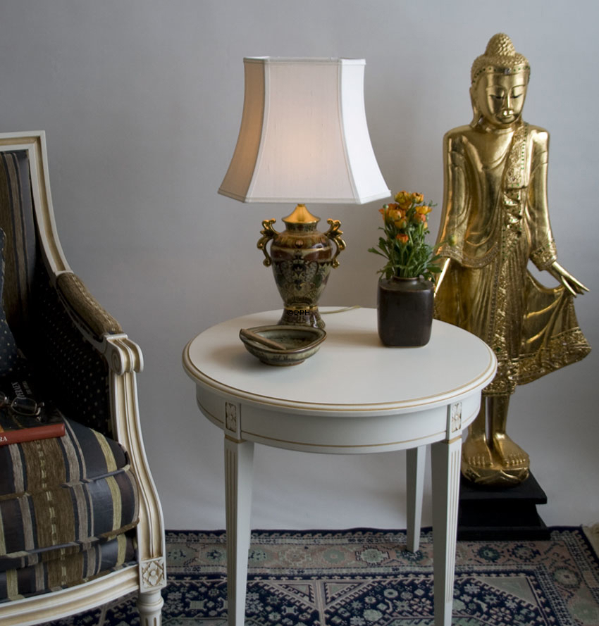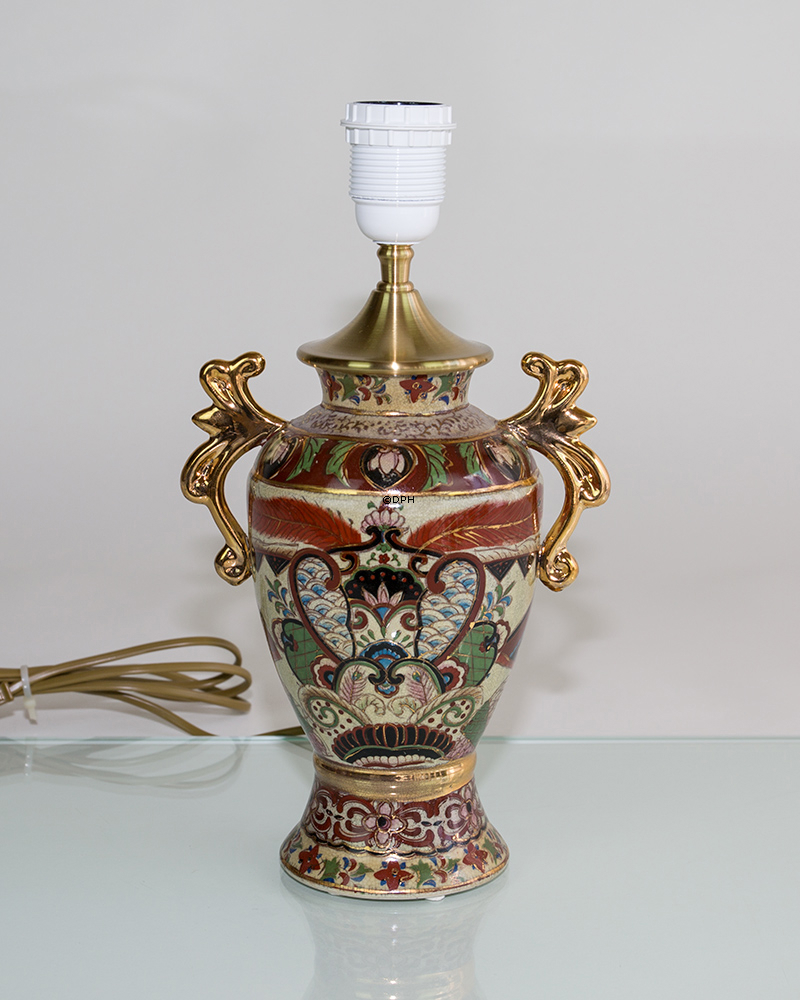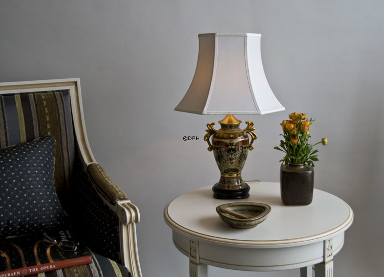 Kinesisk bordlampe med motiv på beige bund med blomsterborter og guld-hanke. Lyskilde max: 1 x 60W standard pære Fatning med afbryder: E27 Spænding: 230V Isolationsklasse: II Bordlampen er monteret på DPH Tradings eget monteringsværksted. Den er monteret med DPHs messing dæksel og ledning med stikprop.