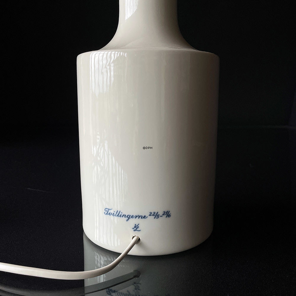 Samleartikler: Bordlampe UDEN skærm Motiv: Tvilling Teknik: Underglasur Designer: Kaj Lange Produseret af Royal Copenhagen for F & M