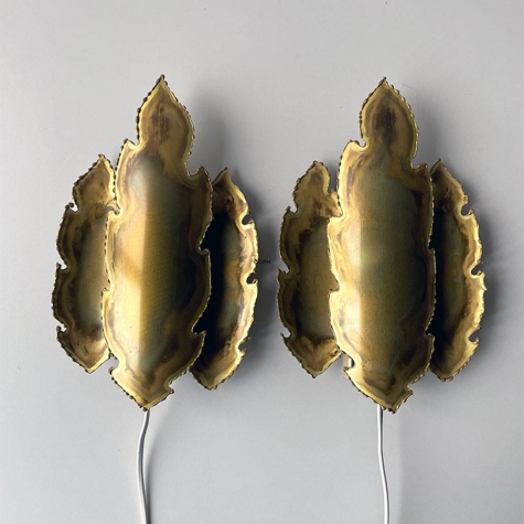 Der er tale om et sæt af 3 stk. væglamper i brutalistisk stil i messing designet af Holm-Sørensen. Væglamperne består af takkede og flammebehandlede messing stykker, hver formet som et langstrakt blad, og placeret på metalbund.