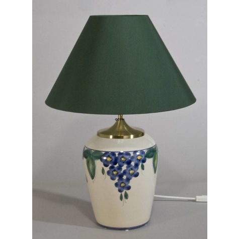 Glaseret keramik bordlampe Max watt: 1 x 40W kronepære Fatning: E27 Spænding: 230V Isolationsklasse: II Monteret med DPH's messing dæksel og ledning med gennemgangs-afbryder og stikprop. Monteret på eget værksted.