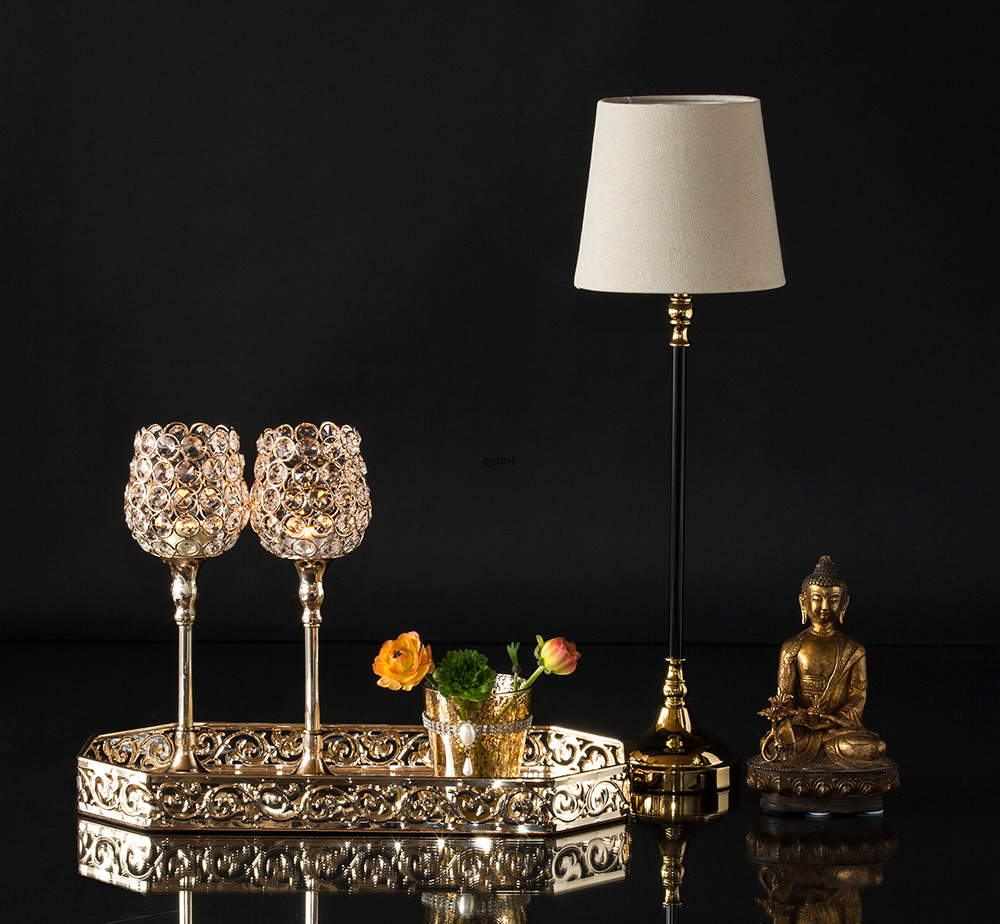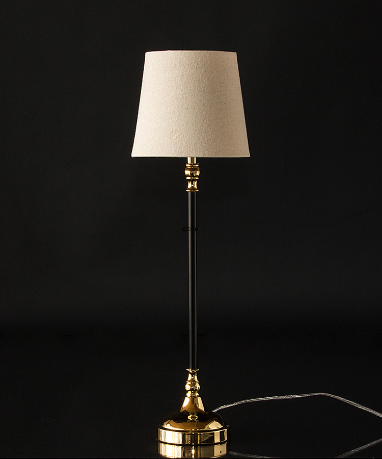 Denne elegante lampe har et smukt finish. Skærmen som følger med lampen står sig godt til lampen og danner et flot samlet billede. Lampen er velegnet til at stå både for sig selv eller i et ensemble sammen med andre pyntegenstande.