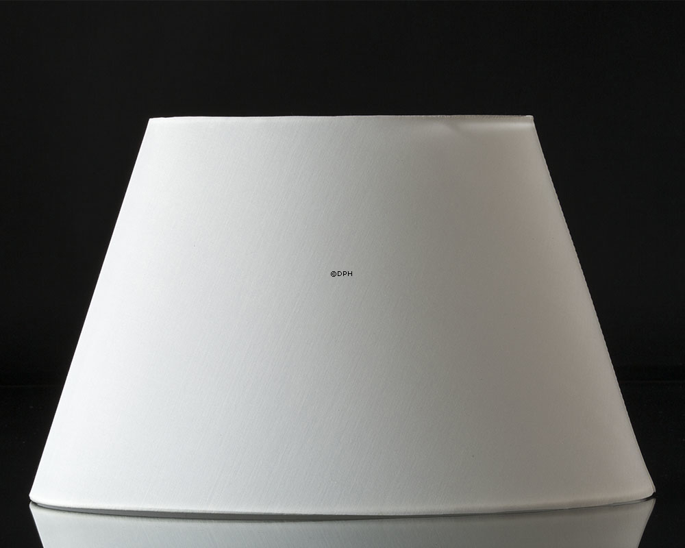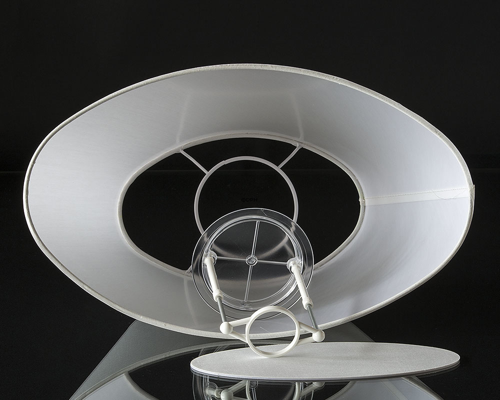 Oval lampeskærm med bærering til skærmstativ. Lampeskrærmen er betrukket med hvid chintz stof. Lampeskærmen er, på grund af den aflange facon, velegnet i vindueskarme, på en skænk eller mindre borde, hvor der ikke er så meget plads. Der er låg til lampeskærmen. LED Max 10 watt