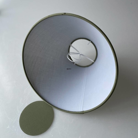 Rund lampeskærm med pæreklemme til krone pære. Lampeskrærmen er betrukket med grøn chintz stof. Der medfølger låg til lampeskærmen.