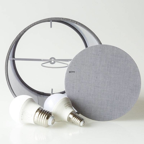 Rund cylinderformet lampeskærm med pæreklemme til krone pære. Lampeskrærmen er betrukket med gråt bomuldstof. Denne lampeskærm passer godt til klassiske lamper. Der medfølger låg til lampeskærmen.