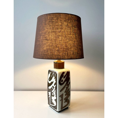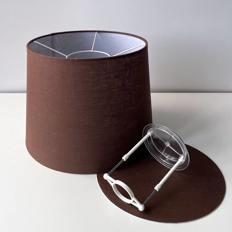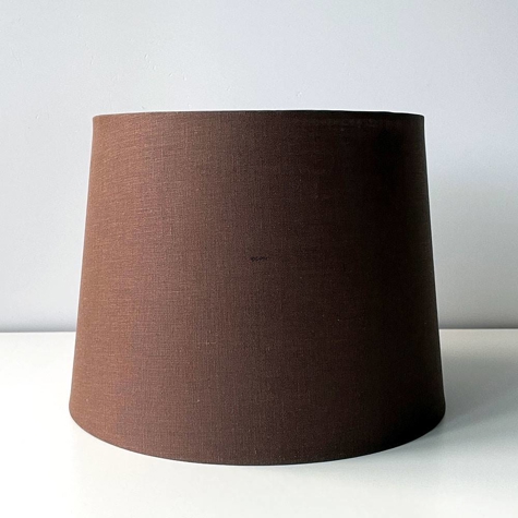 Rund cylinderformet lampeskærm med bærering til skærmstativ. Lampeskrærmen er betrukket med mørkebrunt hørstof. Denne lampeskærm passer godt til klassiske lamper, eksempevis Holmegaard glaslamper. Der medfølger låg til lampeskærmen.