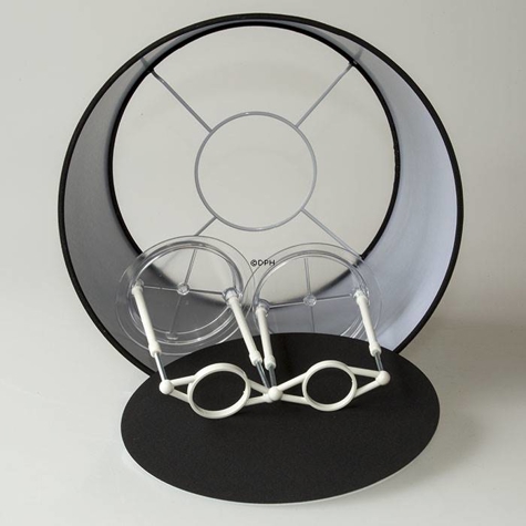 Rund cylinderformet lampeskærm med bærering til skærmstativ. Lampeskrærmen er betrukket med sort chintz stof. Denne lampeskærm passer godt til klassiske lamper, eksempevis Holmegaard glaslamper. Der medfølger låg til lampeskærmen.