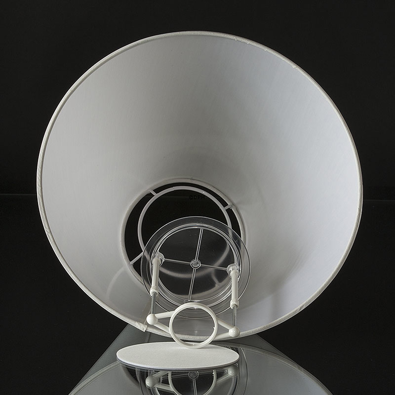 Rund lampeskærm med bærering til skærmstativ. Lampeskrærmen er betrukket med hvid chintz stof. Der medfølger låg til lampeskærmen.