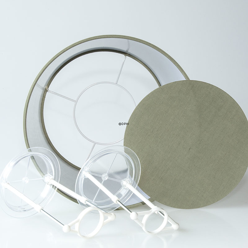 Rund cylinderformet lampeskærm med bærering til skærmstativ. Lampeskrærmen er betrukket med olivengrøn bomuldstof. Denne lampeskærm passer godt til rustikke lamper og Holmegaard glaslamper. Der medfølger låg til lampeskærmen.