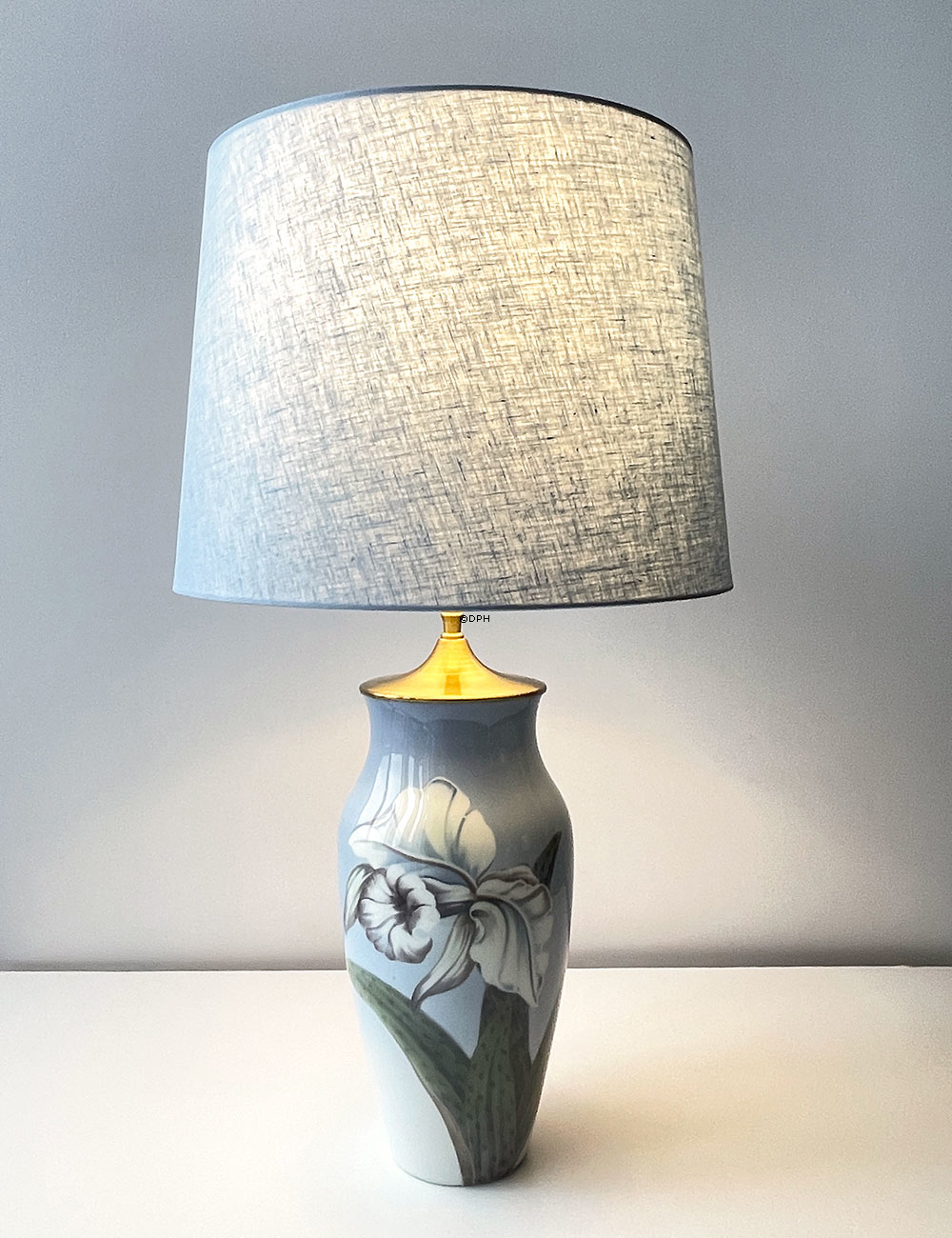 Rund cylinderformet lampeskærm med bærering til skærmstativ. Lampeskrærmen er betrukket med lyseblåt hørstof. Denne lampeskærm passer godt til rustikke lamper og Holmegaard glaslamper. Der medfølger låg til lampeskærmen.