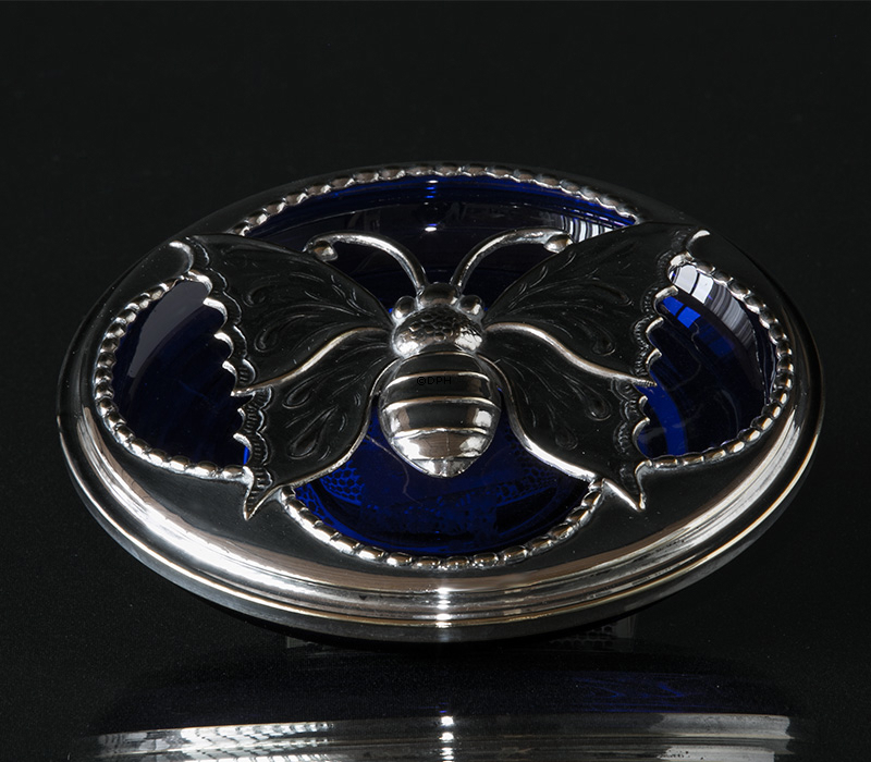 Blå glasskål med top af sølvplet med motiv af en sommerfugl