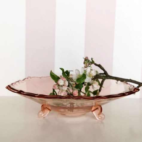 Glas kagefad på tre ben, svagt rosafarvet glas.