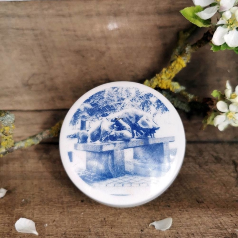 Bonbonniere med motiv af grise på en bænk, Bing & Grøndahl nr. 5810