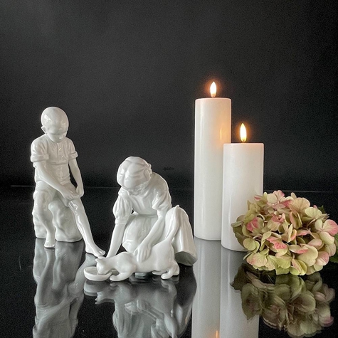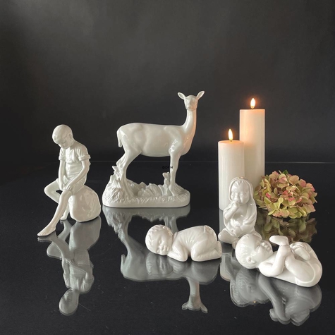 Royal Copenhagen figur af dreng siddende på sten, glaseret. I 2008 lancerede Royal Copenhagen flere af de kendte figurer i helt hvid, deriblandt denne Royal Copenhagen figur af dreng der sidder på sten, som oprindeligt blev designet af Ingeborg Plockross Irminger og produceret af Bing & Grøndahl.