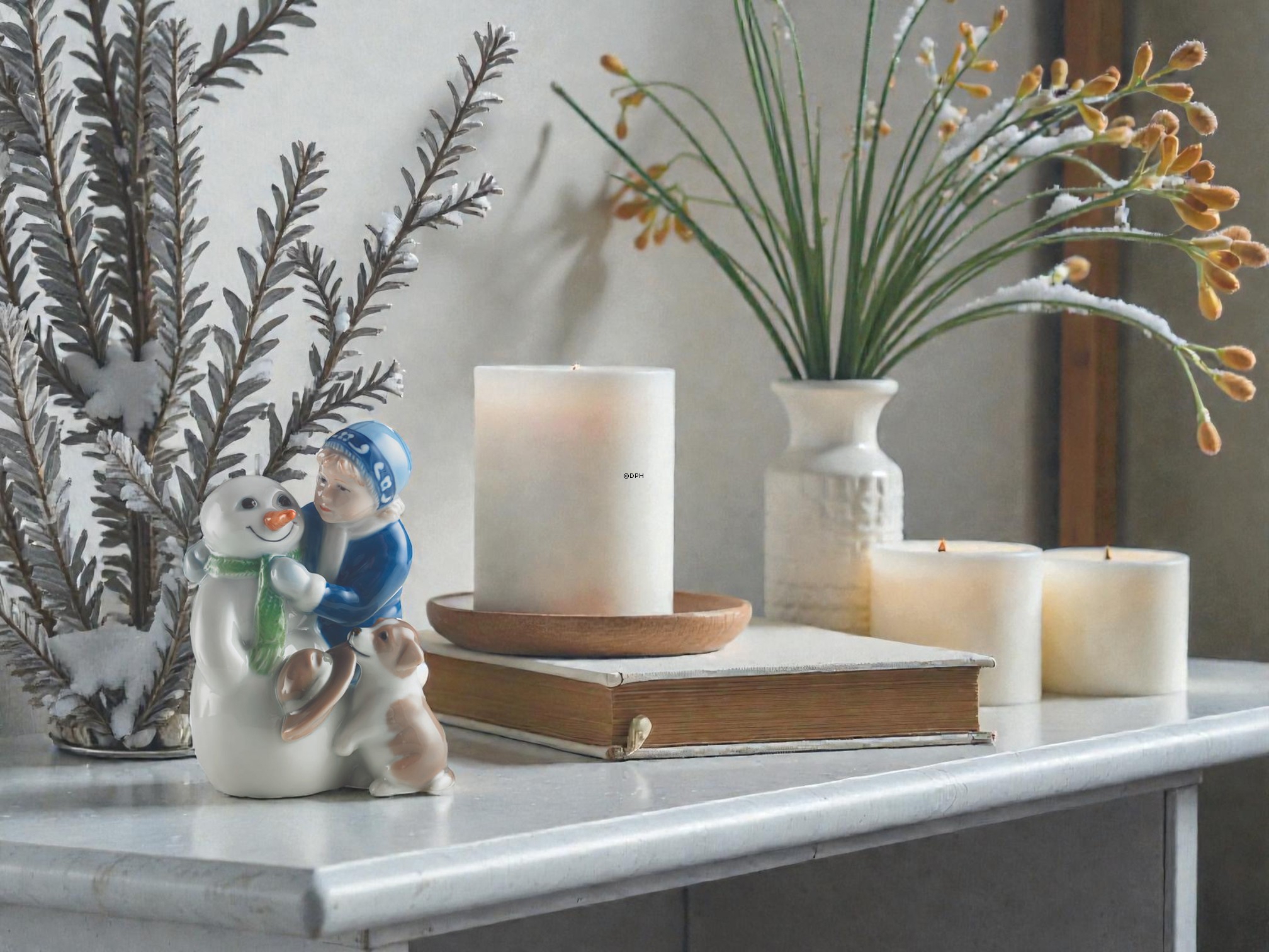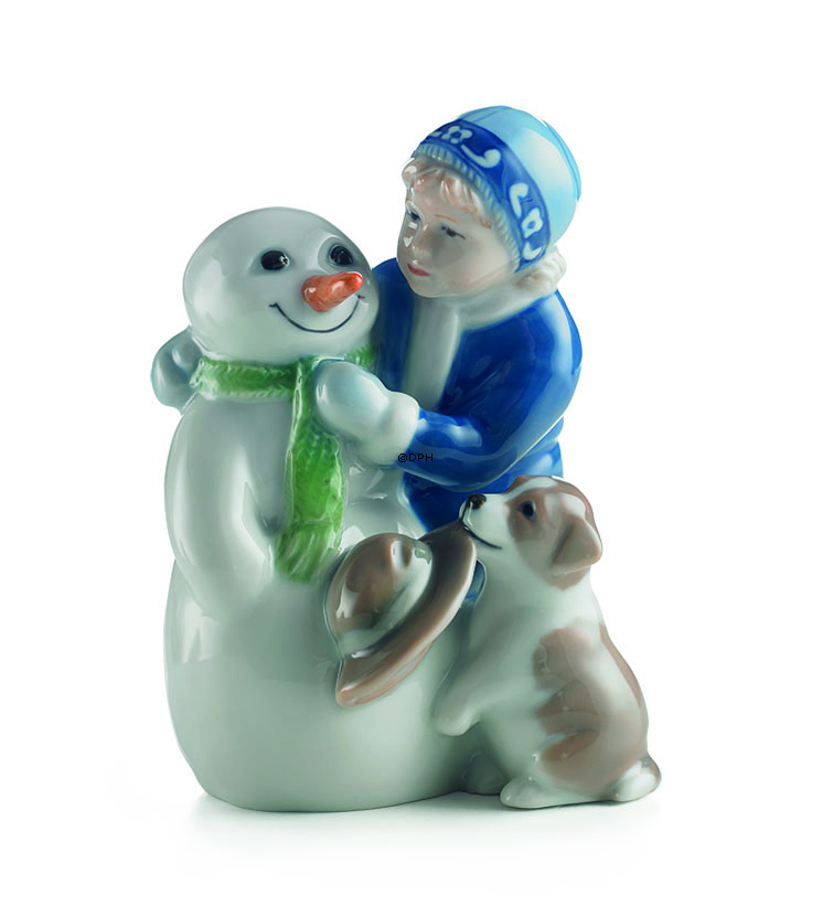 Royal Copenhagen Porcelænsfigur af Else og hendes hund, der bygger en snemand. Serien af Else og Jens figurer blev designet af Ingeborg Plockross Irminger, og er en af Royal Copenhagens bedst kendte figurserier. Figurerne er udført i underglasur.