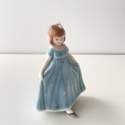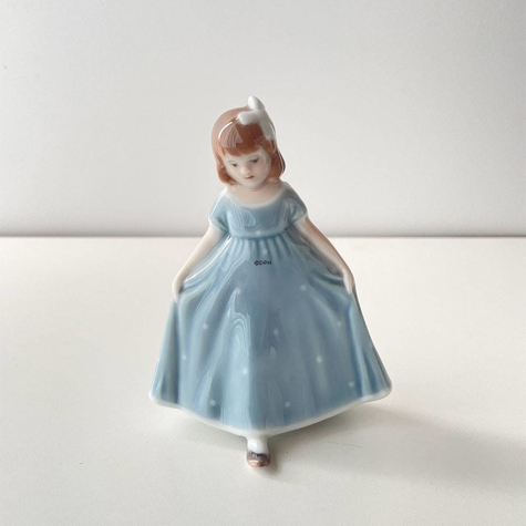 Royal Copenhagen Porcelænsfigur af dansende pige, Pige stående med lyseblå/turkis kjole som hun breder ud, og hvid sløjfe i håret. Serien af Dansende piger, består af fire dansepiger, en med lyserød kjole, en med blå, en med hvis med blåt møster, til sidst en med turkis (lyseblå) kjole med hvide pletter. Denne serie af mini danse piger, som er lavet ud fra original figuren Dansende pige nr R2444 (1021135) som har en højde på 21 cm. og er designete af designet af Ingeborg Plockross Irminger. Alle er udført i underglasur