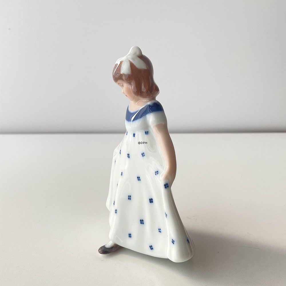 Royal Copenhagen Porcelænsfigur af dansende pige, Pige stående med hvid med blå mønstret kjole som hun breder ud, og hvid sløjfe i håret. Serien af Dansende piger, består af fire dansepiger, en med lyserød kjole, en med blå, en med hvid med blåt møster, til sidst en med turkis (lyseblå) kjole med hvide pletter. Denne serie af mini danse piger, som er lavet ud fra original figuren Dansende pige nr R2444 (1021135) som har en højde på 21 cm. og er designete af designet af Ingeborg Plockross Irminger. Alle er udført i underglasur