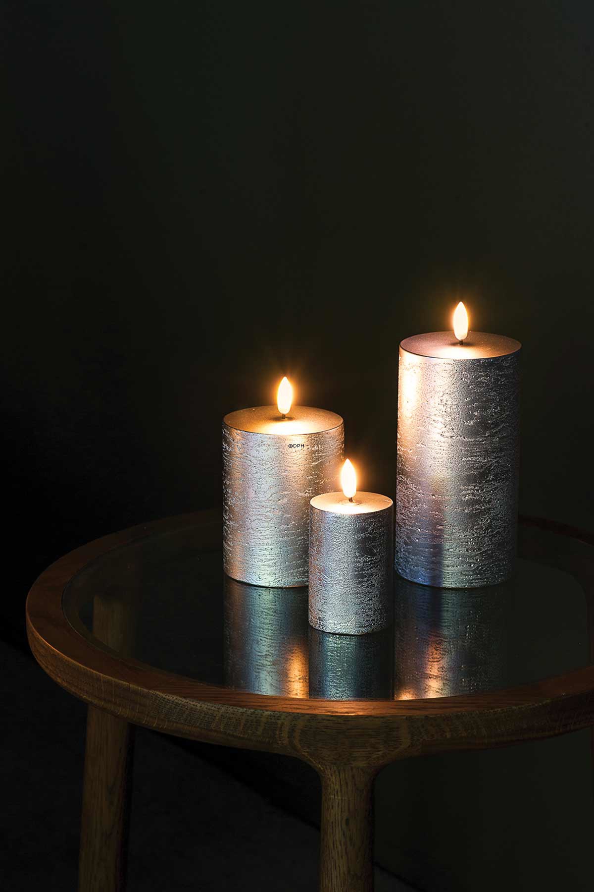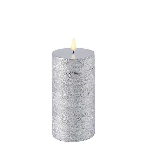 UYUNI Lighting - Bloklys - Metallisk sølv Batterier: 2 x AA (ikke inkluderet) Patenteret 3D Flamme imiterer en rigtig flamme Indbygget 6 timers timer Kan bruges med fjernbetjening (sælges separat) Lavet af ægte paraffinvoks