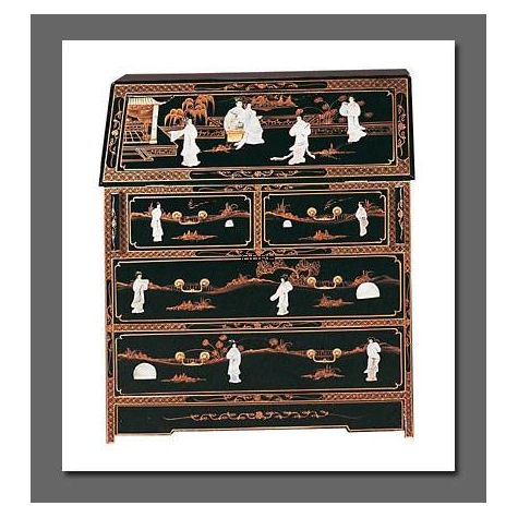 Kinesisk skrivebord. Sort lak med dekorationer i gyldne toner og hvide damer. Blomsterdekorationer på bordpladen. To store og to mindre skuffer forneden.
