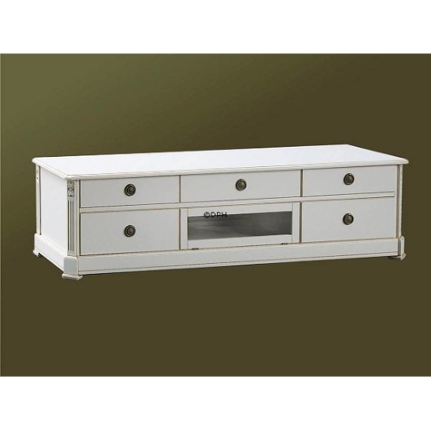 Hvidt TV bord med skuffer og hylde til DVD/video. Bordet har stafferinger langs kanter. Til et sort eller gråt fjernsyn er et hvidt TV bord utoligt smukt. Bordet har skuffer til diverse film og hylde forneden med plads til ledninger fra DVD/video bagud. I samme serie findes både sofabord, lampebord, matchende sofastole og kommode. Bordet kan naturligvis også bruges alene og passer til langt de fleste boligindretninger.