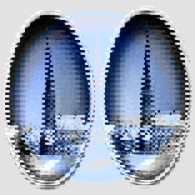 Aluminia juleplaquette med Vor Frelser Kirke som motiv. Plaquetten er udført i underglasur.