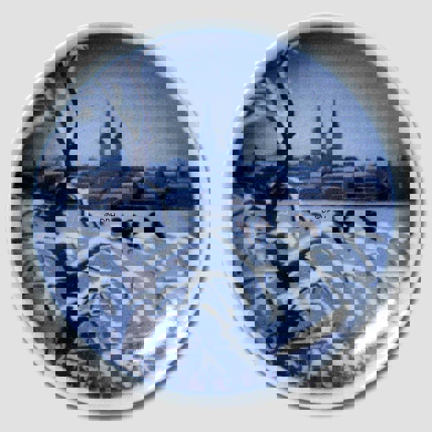 Aluminia juleplaquette med Roskilde i horisonten som motiv. Plaquetten er udført i underglasur.
