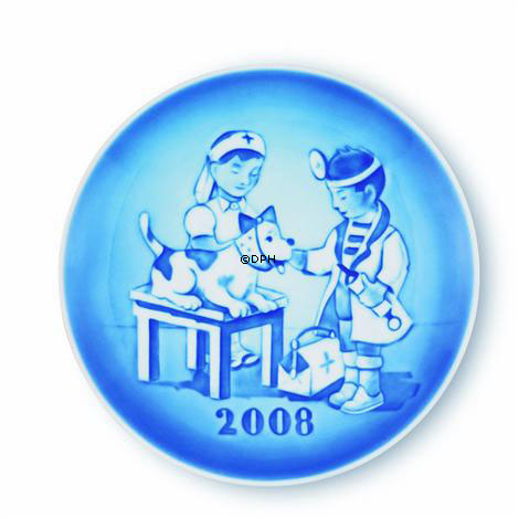 Bing & Grøndahl Barnets dag platte 2008, designet af Sven Vestergaard og udført i underglasur. Titlen på denne Bing & Grøndahl barnets dag platte er Den lille læge. I 2008 ses søster og bror, der tager sig af familiens hund.