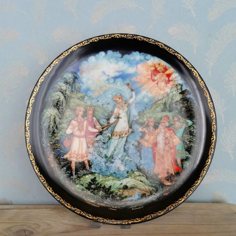 The SnowMaiden is the 1st issue of 8 in The Legend of the Snow Maiden Series of plates. 7 3/4" in diameter plate is based on the opera The Snow Maiden or Snowmaiden by artist Master Kamorin for Kholui Art Studios. This is a stunning plate from original black laquer w/gold rim.