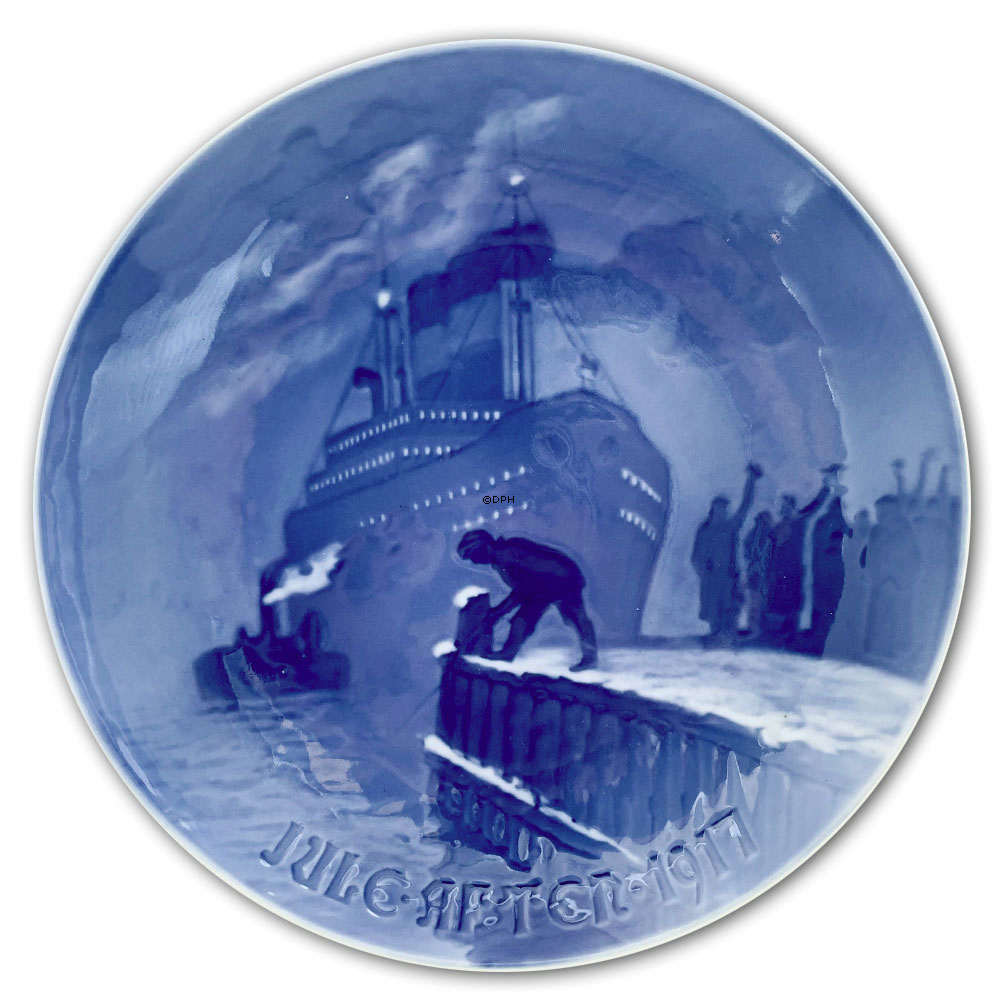 Bing & Grøndahl juleplatte 1917, designet af Achton Friis, har titlen Juleskibet ankommer. Bing & Grøndahls juleplatte fra 1917 viser juleskibets ankomst. Dette refererer til skibet som i December måned ankom fra USA med udvandrere og deres efterkommere. Båden er smykket med flag, og på kajen står familie og venner og venter og hilser.