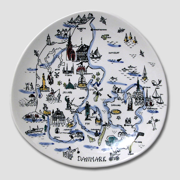 Håndmalet fajance platte med motiv af Danmark med nogle af de store danske seværdigheder. Platten er designet af Inger Waage.