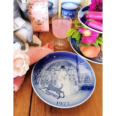 Motivet på denne Desiree juleplatte 1977 er hentet fra H. C. Andersens eventyr Snemanden. H.C.Andersens snemand står på sin anden levedag og nyder herlighederne som han kan se gennem vinduerne i kælderen. Rundt om ham springer lænkehunden, som fortæller om Snemandens forgængere, om hvordan solen har fået dem til at løbe og hvad der ville ske, hvis Snemanden kom ind i stuen og hen til kakkelovnen. Platten er designet af Svend Otto S. Porcelænsfabrikken Désirée startede serien af juleplatter i 1970 og sluttede den i 2002. Motiverne på alle juleplatterne er inspireret af Hans Christian Andersens eventyr.