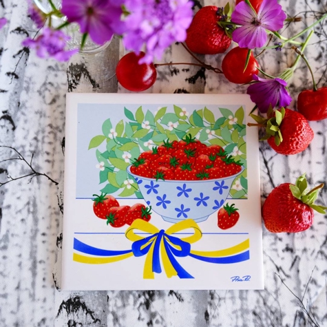 Gustavsberg kakkel i serien "Sommer i Sverige", designet af Pia Ronndahl. Motivet på denne kakkel er en skål med jordbær.
