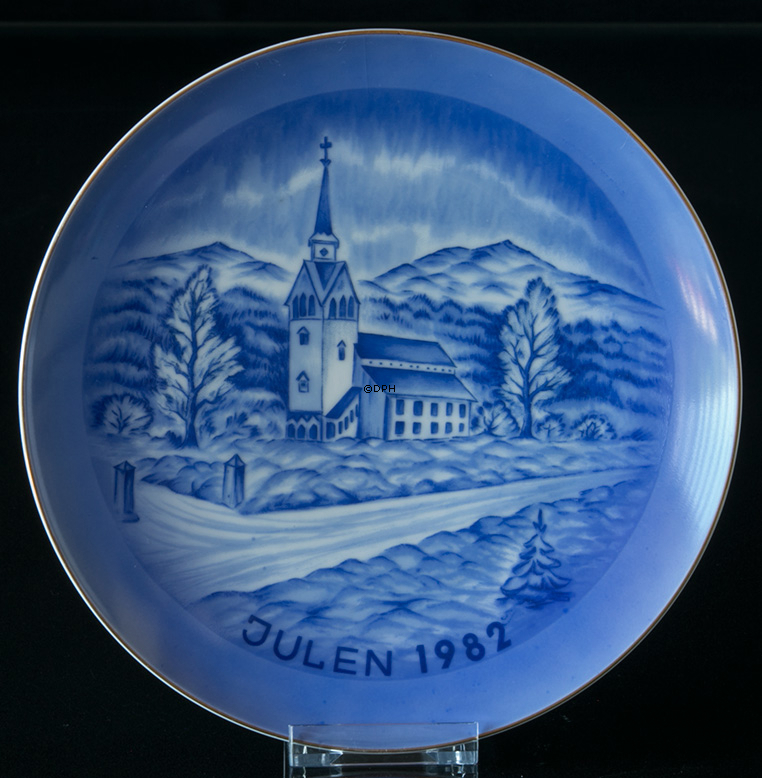 Juleplatte eller juletallerken 1982 med motiv af landsbykirke.