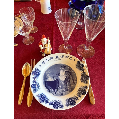 Tallerkenen er kantet med et smukt mønster af grantræsgrene og snefnug, som skaber en følelse af en skandinavisk vinterskov og tilfører en ekstra dimension af julestemning til scenen.