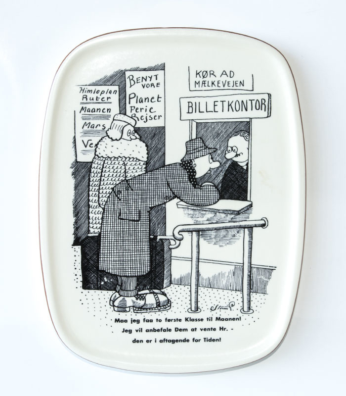 Samleartikler: Storm P. platter Indskrift: Maa jeg faa to første Klasse til Maanen! Jeg vil anbefale Dem at vente Hr. - den er aftagende for Tiden! Designer: Johannes Hansen Firkantet platte.