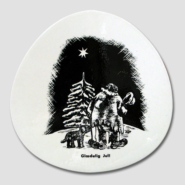 Samleartikler: Storm P. platter Motiv: Vagabond og hans hund ved træet juleaften Indskrift: - Glædelig Jul ! Teknik: Udgivelses-år: Designer: Johannes Hansen Diameter: 6" - 16 cm (Formen er "trekantet" uden hjørner)