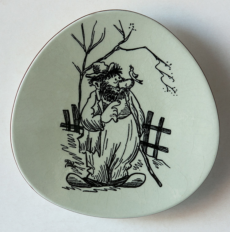 Samleartikler: Storm P. platter Motiv: Vagabonden og den frie fugl. Indskrift: Ingen Teknik: Udgivelses-år: Designer: Johannes Hansen Diameter: 6" - 16 cm (Formen er "trekantet" uden hjørner)