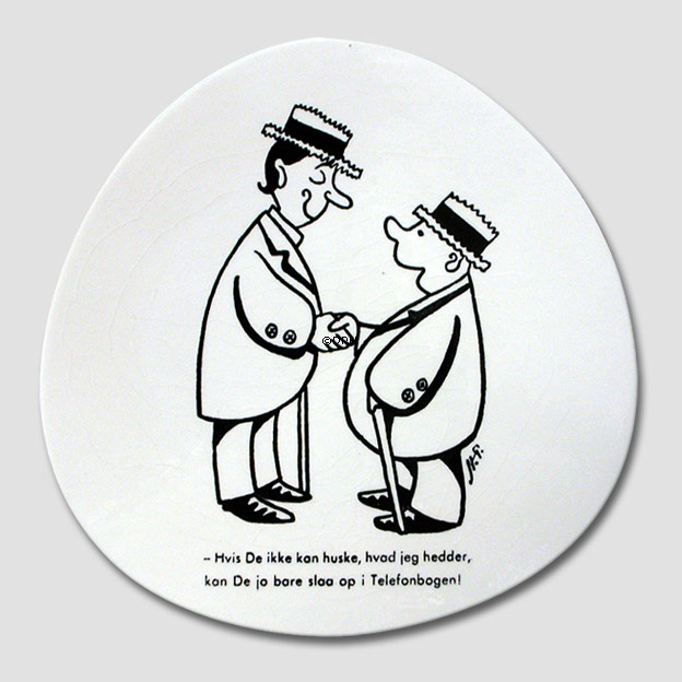 Samleartikler: Storm P. platter Motiv: To mænd mødes. Indskrift: - Hvis De ikke kan huske, hvad jeg hedder, kan De jo bare slaa op i Telefonbogen. Teknik: Udgivelses-år: Designer: Johannes Hansen Diameter: 6" - 16 cm (Formen er "trekantet" uden hjørner)
