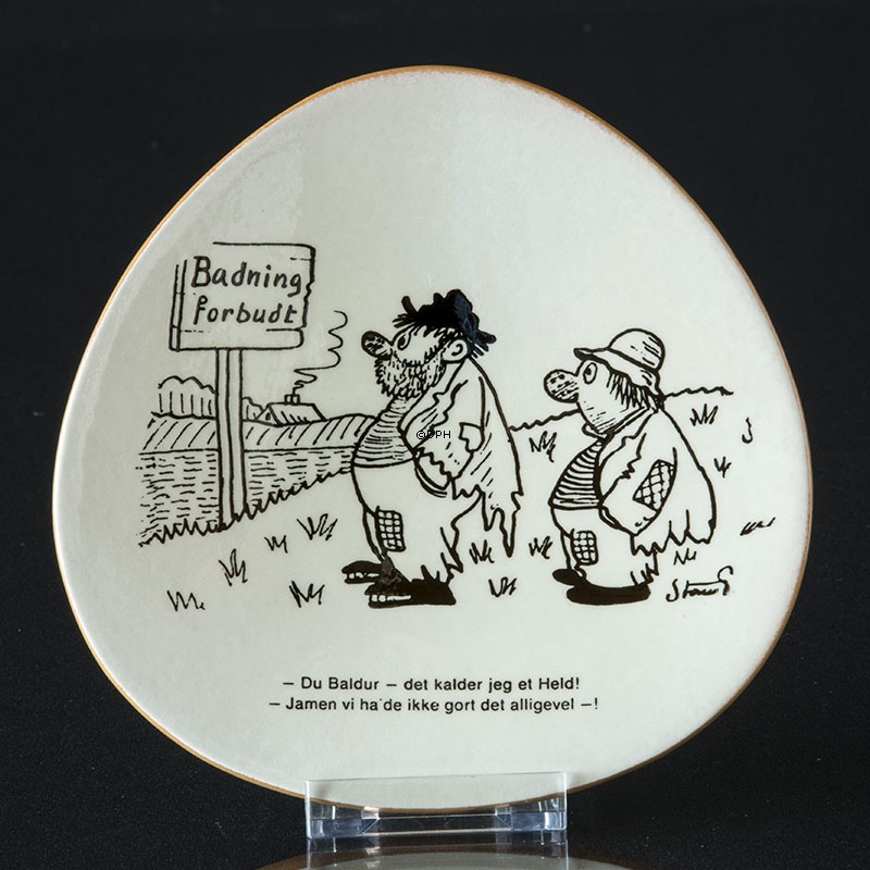 Samleartikler: Storm P. platter Indskrift: Badning forbudt - Du Baldur - det kalder jeg held! - Jamen vi havde ikke gjort det alligevel! Designer: Johannes Hansen Diameter: 6" - 16 cm (Formen er "trekantet" uden hjørner)
