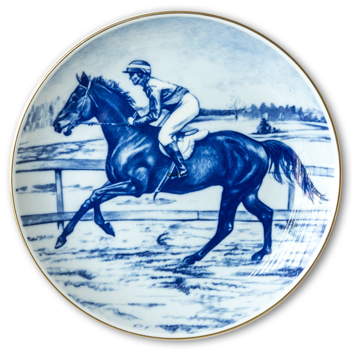 Ravn Porcelæn, Engelholm Sweden, hesteplatte med motiv af rytter på galophest. Motivet skildrer Ylva Loven Sward på Tammer Fors. Platten er designet af Pia Torek efter billede af Arne Eilert.