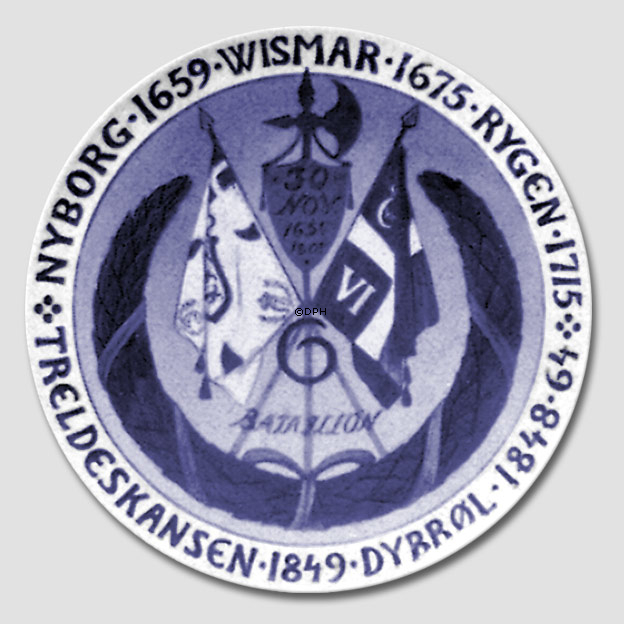 Royal Copenhagen Mindeplatte Udgivelsesår: 1907 Oplag: 350 eksemplarer Designer: Arnold Krog Diameter: 22,5/32 cm Motiv / Produceret i anledning af: Bataillons 25o-års jubilæum. Pyramide af to faner og en standard med skjold og indskrift: 30 NOV. 1657-1907 og f.n. 6. BATAILLON. På kanten NYBORG 1659 - WISMAR 1675 - RYGEN 1715 - TRELDESKANSEN 1849 - DYBBØL 1848-64 (slag i hvilke bataillonen har deltaget).