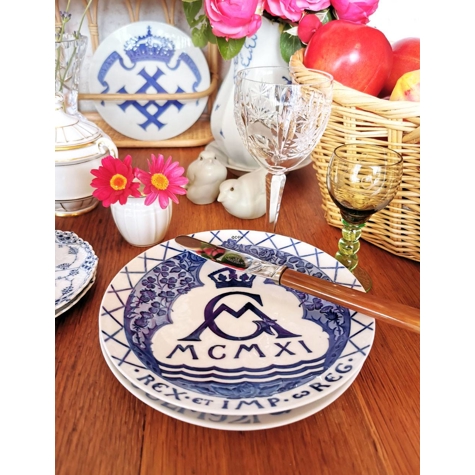 Royal Copenhagen Mindeplatte Udgivelsesår: 1911 Oplag: 1936 eksemplarer Designer: Arnold Krog Diameter: 17,5 cm Motiv / Produceret i anledning af: Engelsk kroningsplatte. Kronet monogram GM (Georg V og Mary) MCMXI.