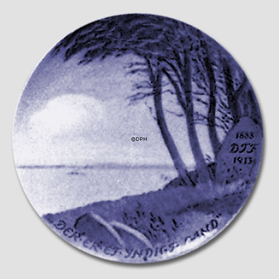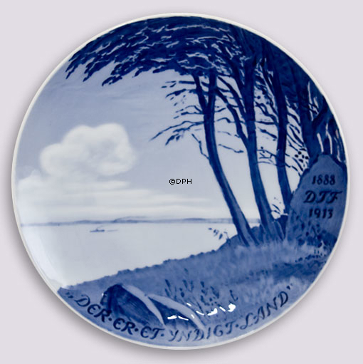 Royal Copenhagen Mindeplatte Udgivelsesår: 1913 Oplag: 573 eksemplarer Designer: Oluf Jensen Diameter: 17,5 cm Motiv / Produceret i anledning af: Danmarks Turistforening. Landskab med træer og vand. På en sten indhugget 1888 D. T. F. 1913. Nederst indskrift: DER ER ET YNDIGT LAND. Fremstillet i anledning af foreningens 25-års jubilæum.