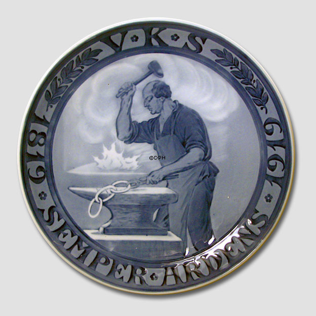Royal Copenhagen Mindeplatte Udgivelsesår: 1919 Oplag: 1500 eksemplarer Designer: Chr. Thomsen Diameter: 23 cm Motiv / Produceret i anledning af: Odd Fellow-platte. Smed der sammen- smeder de tre ringe. Indskrift: SEMPER ARDENS (altid brændende) V.K.S. 1819-1919.