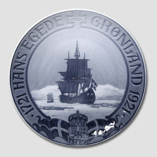 Royal Copenhagen Mindeplatte Udgivelsesår: 1921 Oplag: Ukendt Designer: Chr. Benjamin-Olsen Diameter: 23 cm Motiv / Produceret i anledning af: Hans Egede-platte. Dansk orlogsskib i isfyldt farvand. Indskrift: HANS EGEDE GRØNLAND 1721 - 1921. F. n. kronet rigsvåben og flag. Udført i 2oo-året for Hans Egedcs rejse til Grønland.