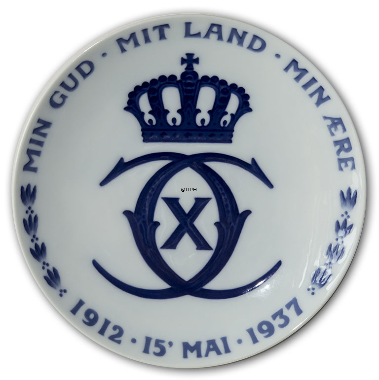 Royal Copenhagen Mindeplatte Udgivelsesår: 1937 Oplag: Ukendt Designer: Richard Bøcher Diameter: 19 cm Motiv / Produceret i anledning af: Christian X.s regeringsjubilæum. Kronet spejlmonogram CX og indskrift: MIN GUD MIT LAND MIN ÆRE 1912 15 MAJ 1937.