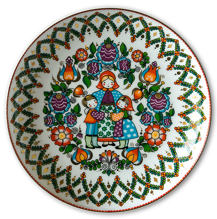 Steinböck morsdagsplatte i emaljeret metal med en mor og hendes to børn.