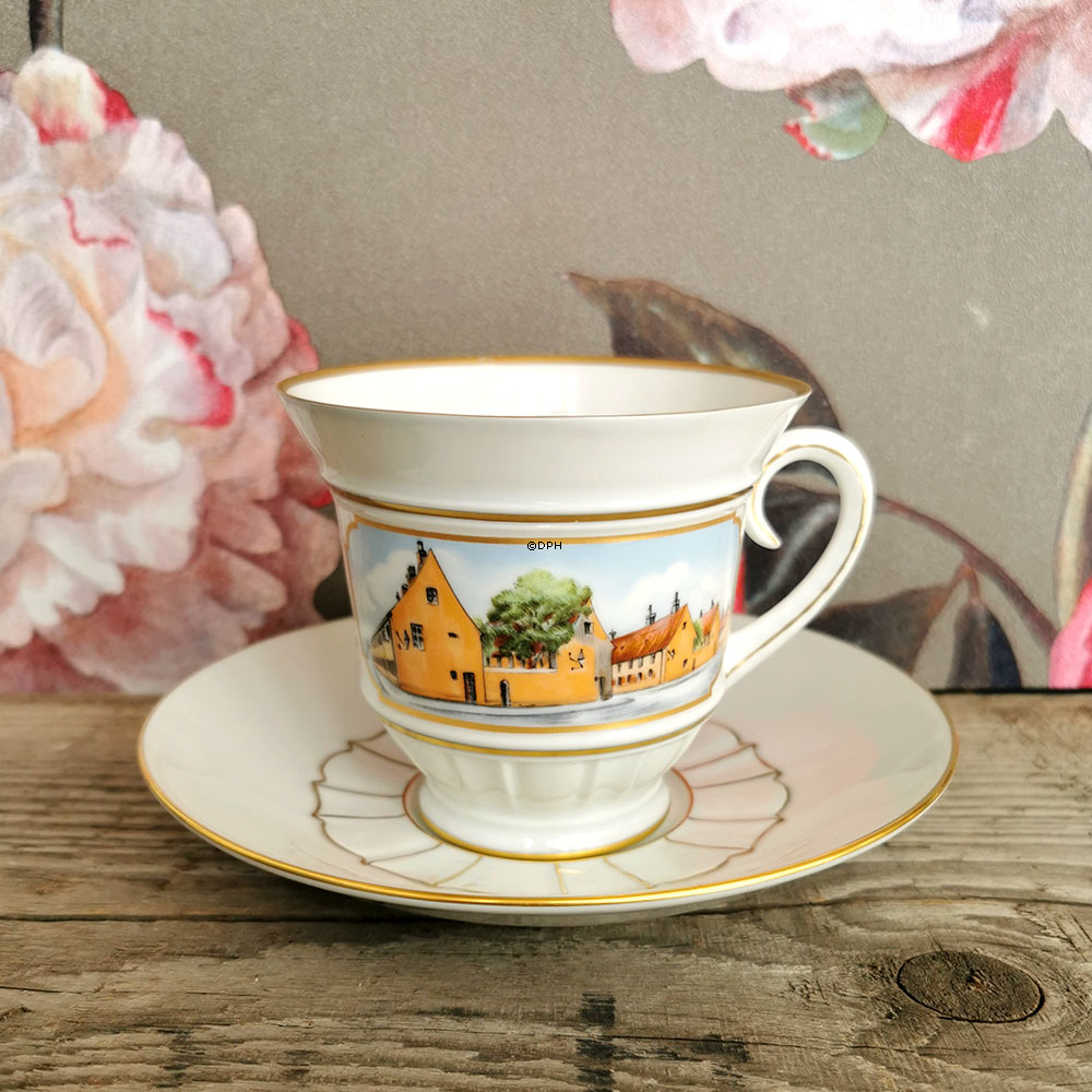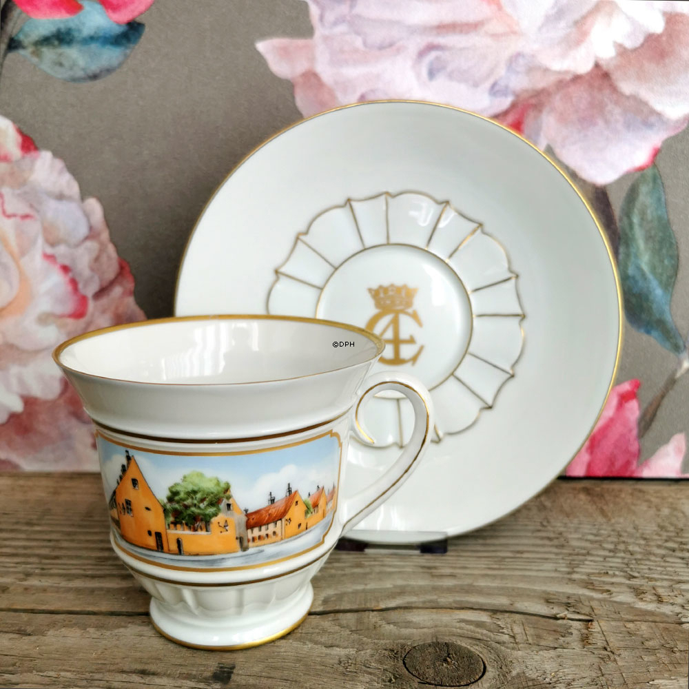 Bing & Grøndahl morgenkop med motiv af Nyboder, underkop og kop med Christian d. 4's monogram. Udgivet i 1981 i anledning af Nyboders 350 års jubilæum Morgenkop 9 x 10 cm og underkop 16 cm.